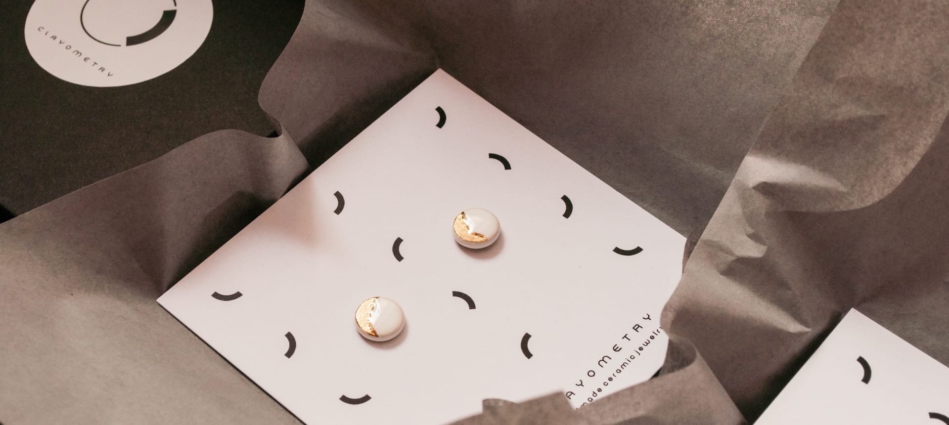 Clayometry’s handmade ceramic jewelry is created for those who prefer subtle details over loud statements. In this collection you’ll find earrings, delicate pendants and sculptural brooches made from speckled grey stoneware and deep black porcelain. Soft organic forms, simple geometric compositions and calm glazes are paired with touches of glossy gold or platinum lustre and the occasional tiny pearl.