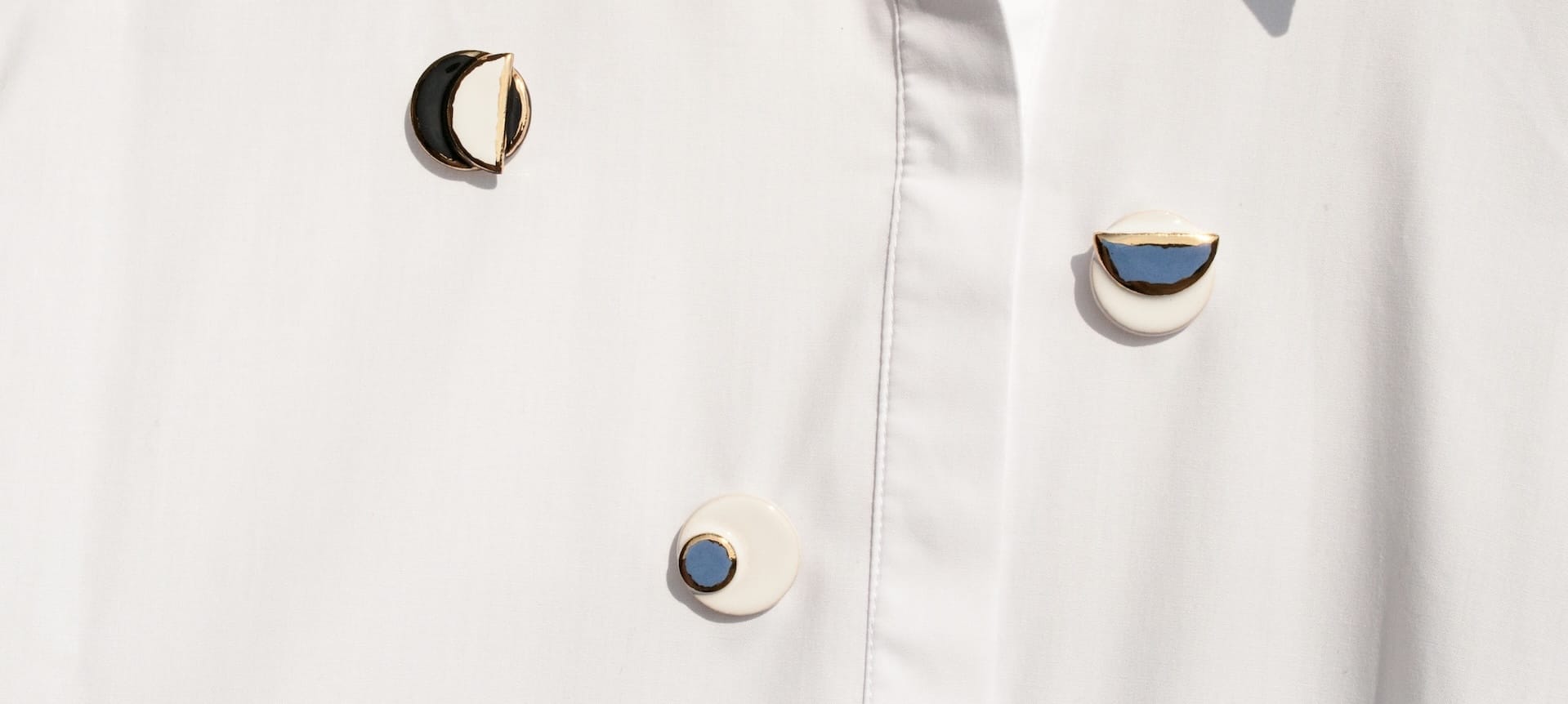 Clayometry’s handmade ceramic brooches bring together graphic shapes, calm colours and a sculptural feel. The collection features rectangular and triangular compositions in speckled stoneware and black clay, finished with layers of mint green, sand, white or sky–blue glaze. Many pieces are accented with glossy gold lustre along the edges or on a single raised element, creating a subtle contrast against the matte ceramic surface.