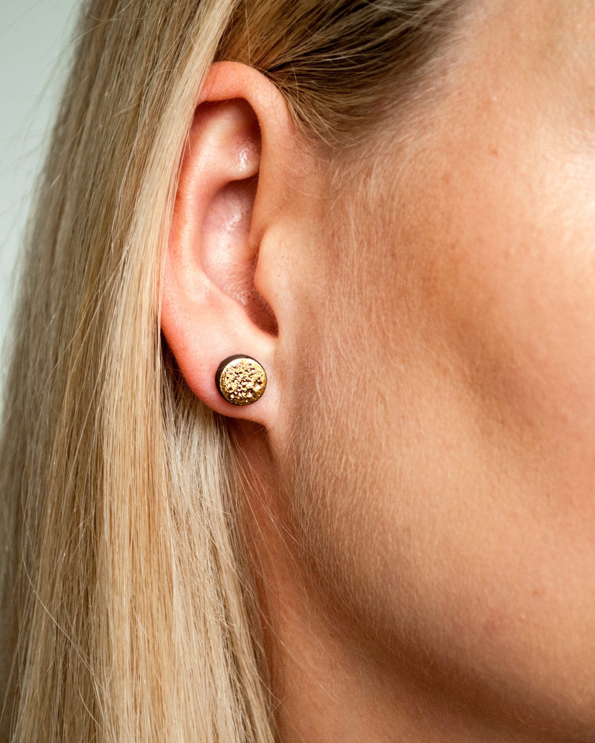 Apvalūs keraminiai auskarai su mėnulio tekstūra ir aukso liustra