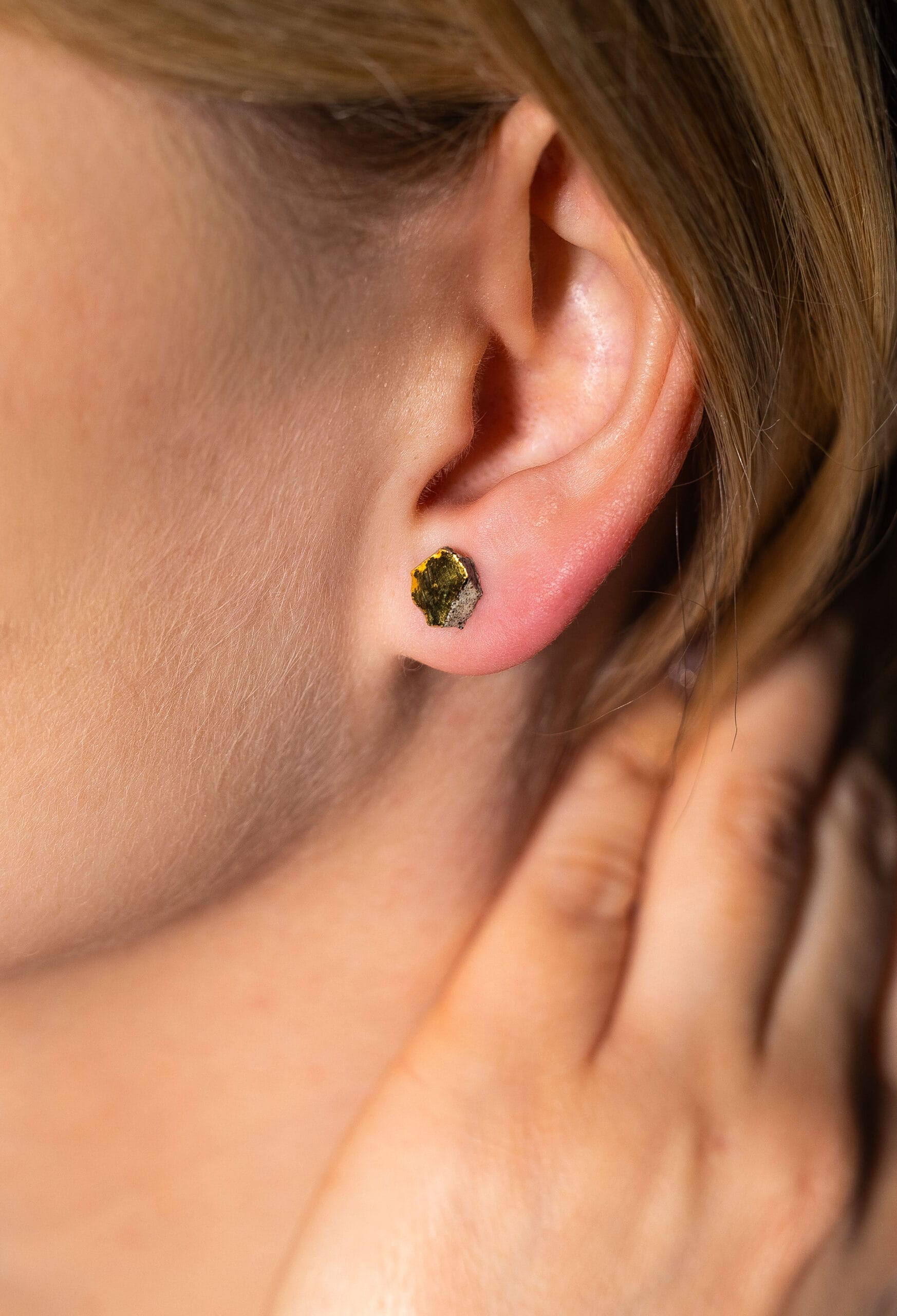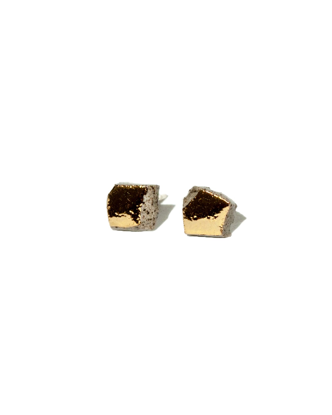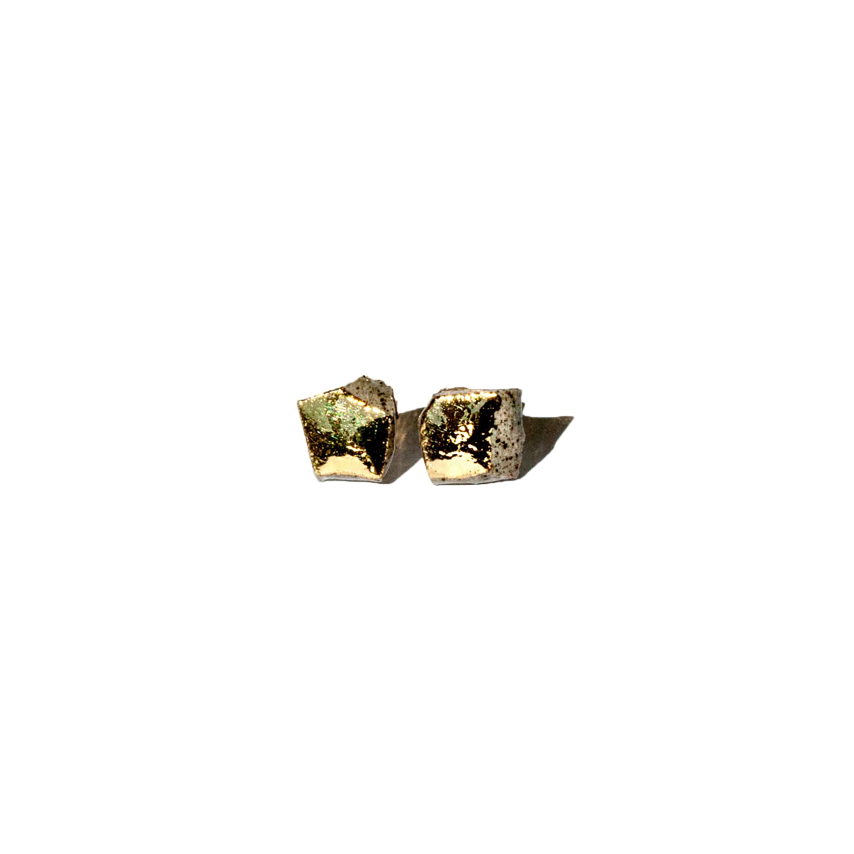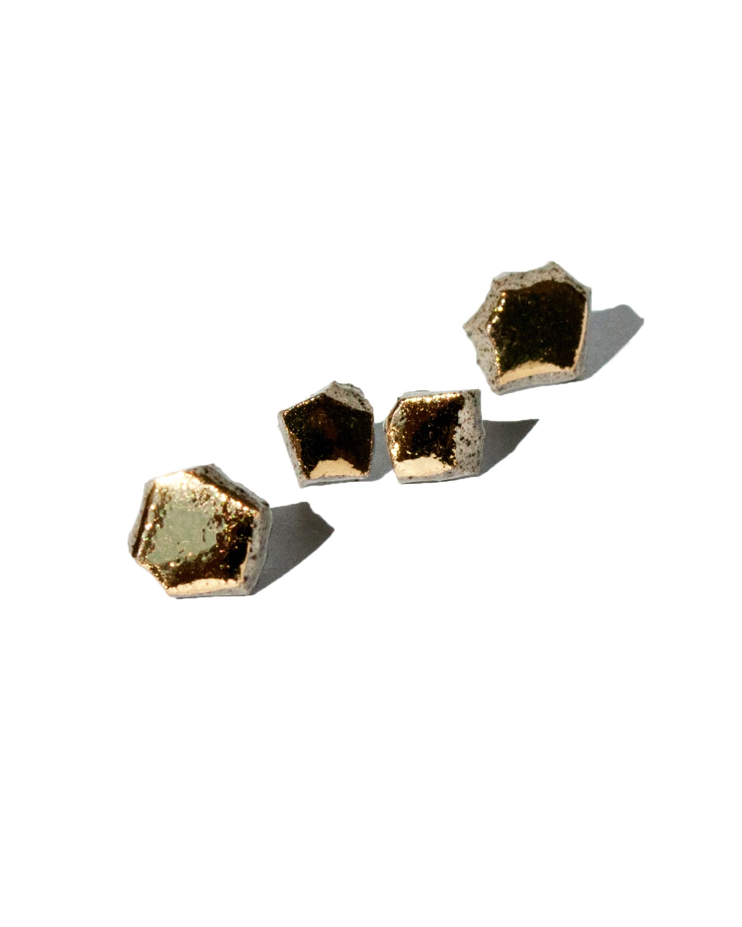 Golden Smithereens Small auskarai lyg dužusio aukso veidrodžio šukės. Pagaminti iš pilko akmens masės molio, primenančio betoną, netolygių formų, vienetiniai. Viršutinė plokštuma padengta aukso liustra, kuri sukuria veidrodinį atspindį, o šonai glazūruoti skaidria, blizgia glazūra, suteikiančia subtilų kontrastą.