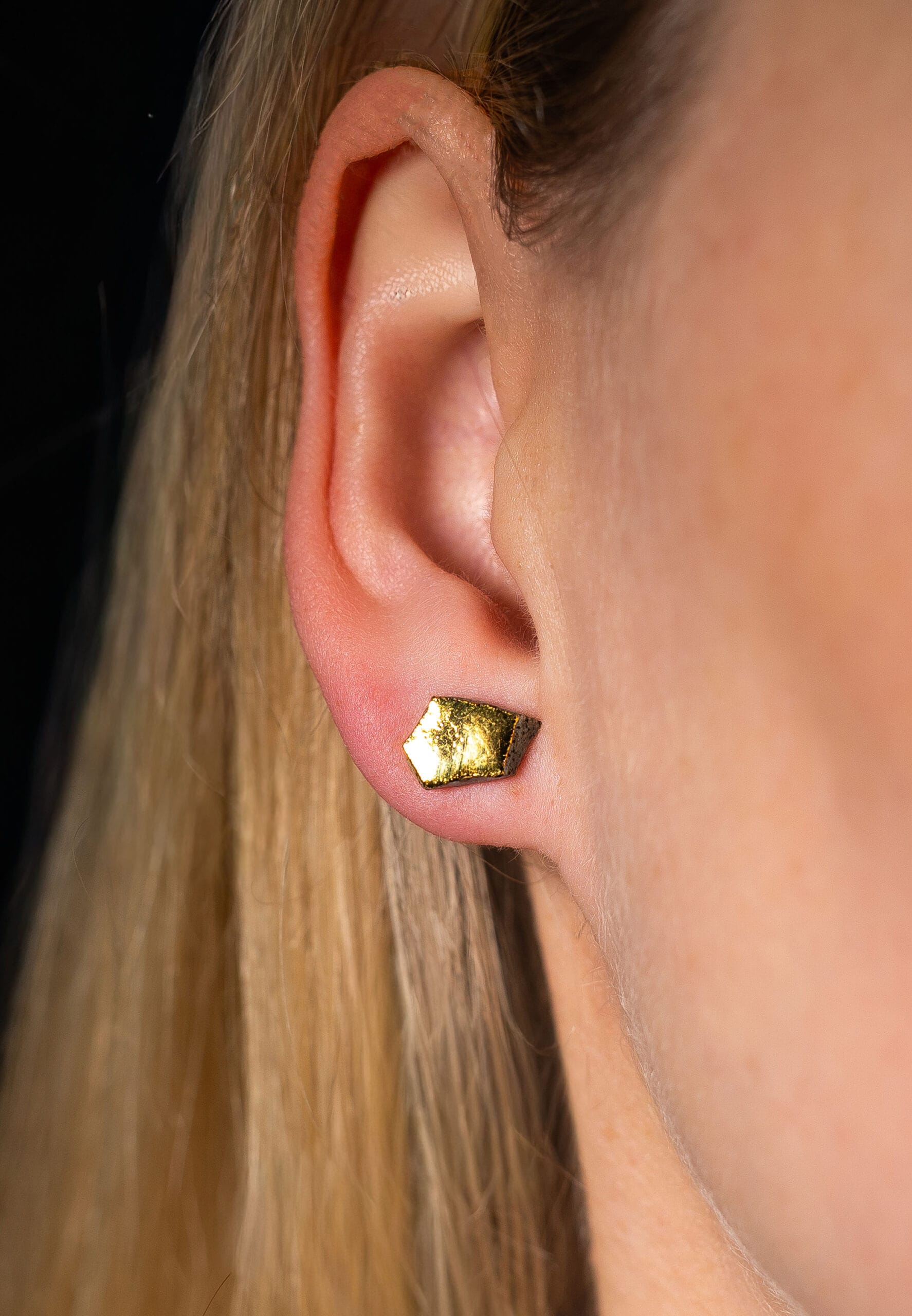 Golden Smithereens auskarai lyg dužusio auksinio veidrodžio šukės. Pagaminti iš pilko akmens masės molio, primenančio betoną, netolygių formų, vienetiniai. Viršutinė plokštuma padengta rankomis užtepta aukso liustra, kuri sukuria veidrodinį atspindį, o šonai glazūruoti skaidria, blizgia glazūra, suteikiančia subtilų kontrastą.