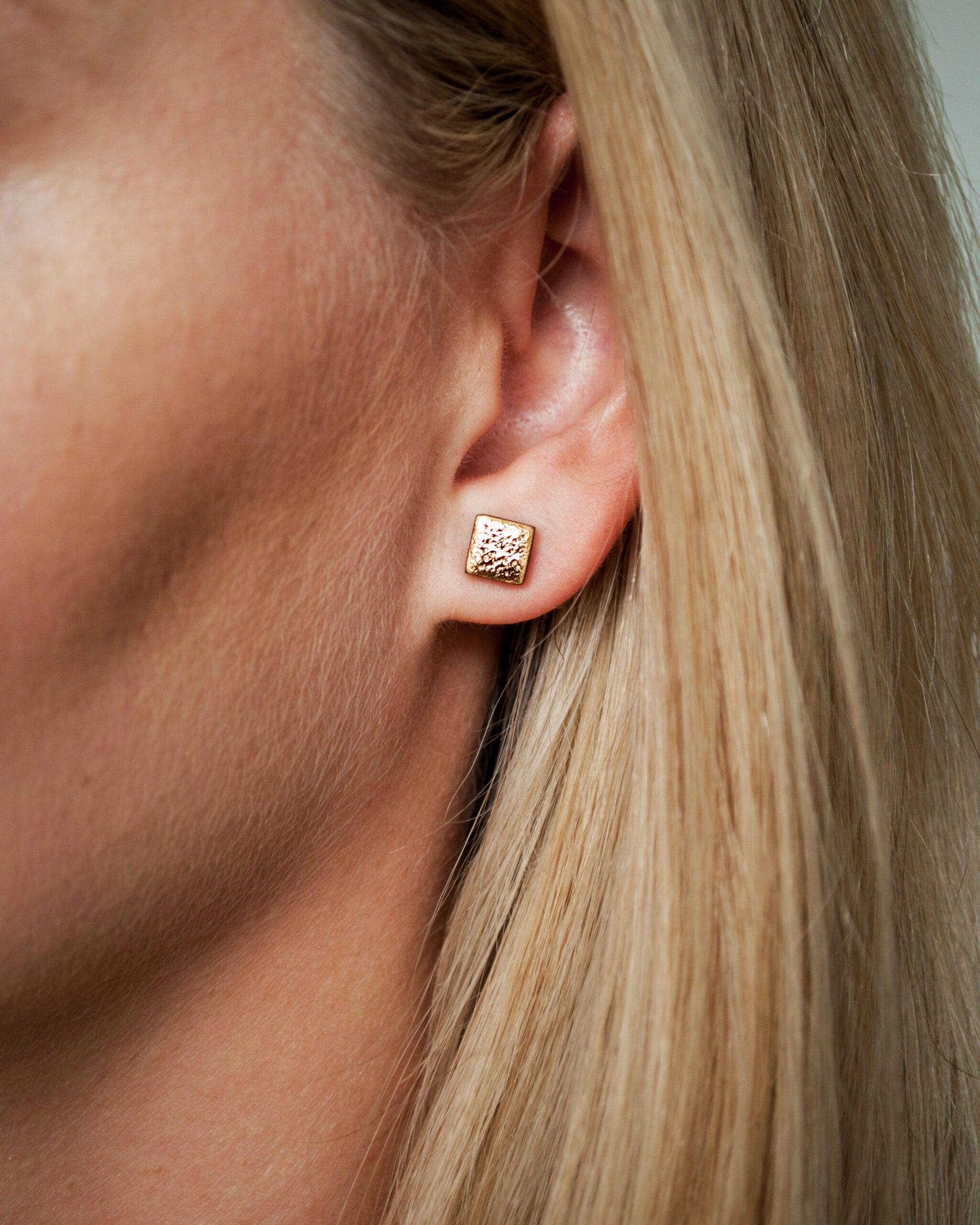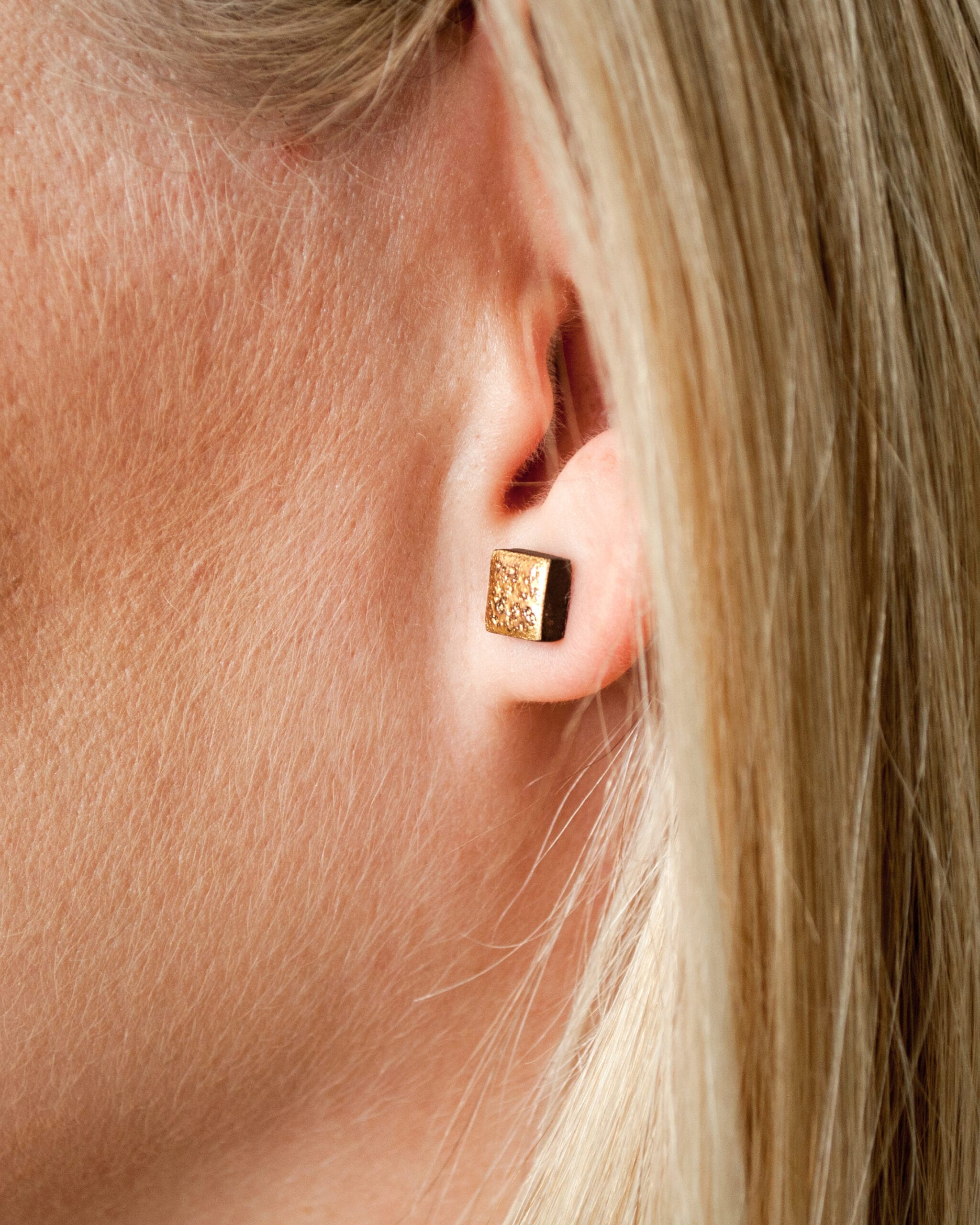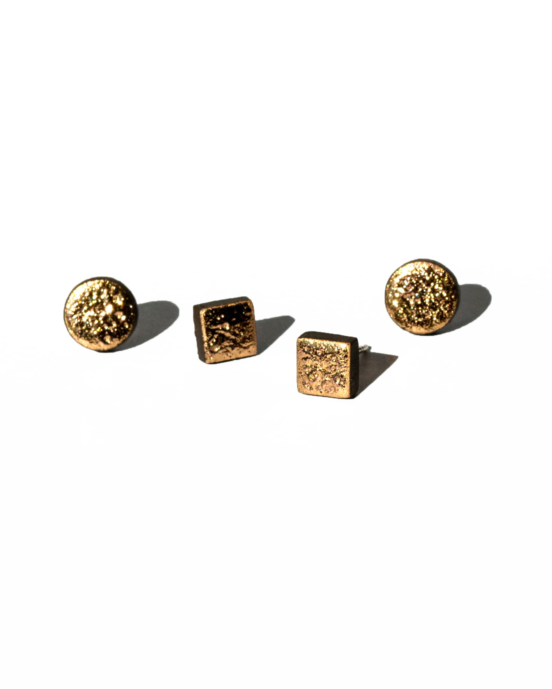 Minimalistiniai kvadratiniai auskarai vinukai, pagaminti rankomis iš juodo molio. Paviršius dekoruotas išskirtine mėnulio tekstūra, kuri paryškinama 24k aukso liustra – šis akcentas suteikia švelnaus kontrasto ir subtilaus spindesio natūraliam molio paviršiui.