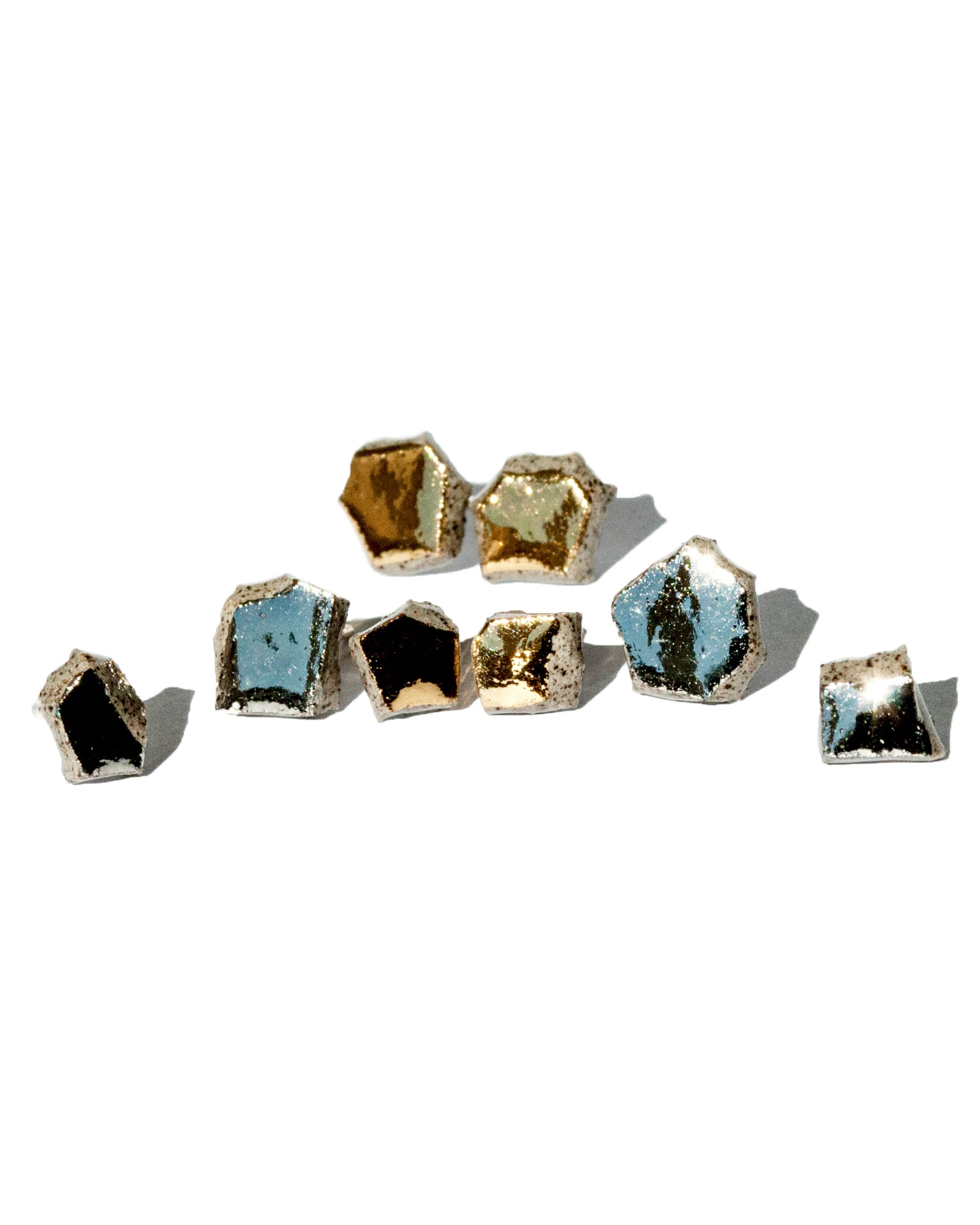 Platinum Smithereens auskarai lyg dužusio veidrodžio šukės. Pagaminti iš pilko akmens masės molio, primenančio betoną, netolygių formų, vienetiniai. Viršutinė plokštuma padengta rankomis užtepta platinos liustra, kuri sukuria veidrodinį atspindį, o šonai glazūruoti skaidria, blizgia glazūra, suteikiančia subtilų kontrastą.