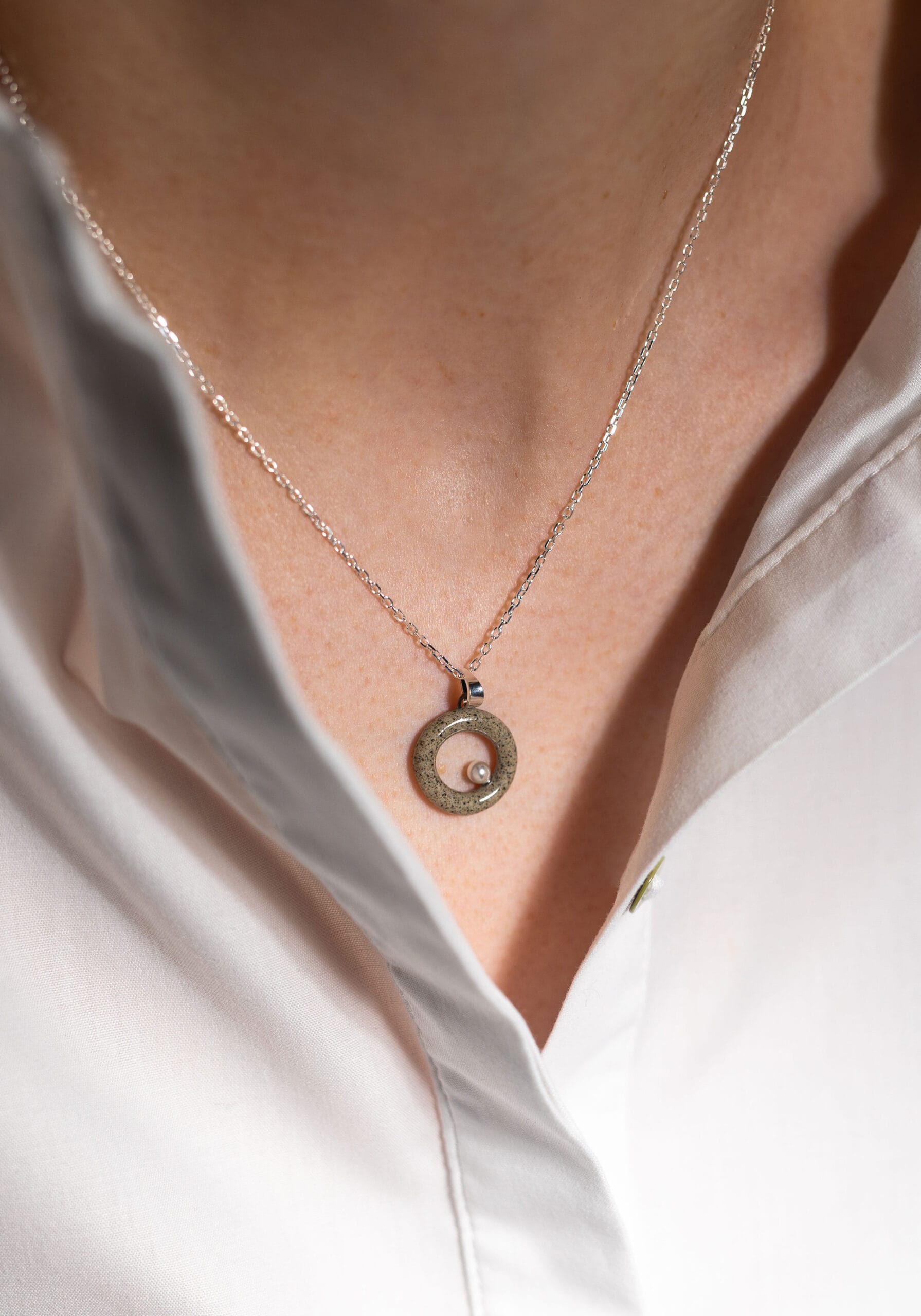 Tai unikalus rankų darbo keraminis papuošalas, sukurtas iš akmens masės molio su juodu šamotu. Šis keraminis pakabukas simbolizuoja pusiausvyrą ir tylią eleganciją. Žiedo formos pakabukas apgaubia mažą baltą perlą, perteikdamas ramybės akimirką ir harmoningą ryšį tarp natūralaus molio bei subtilaus perlų spindesio.