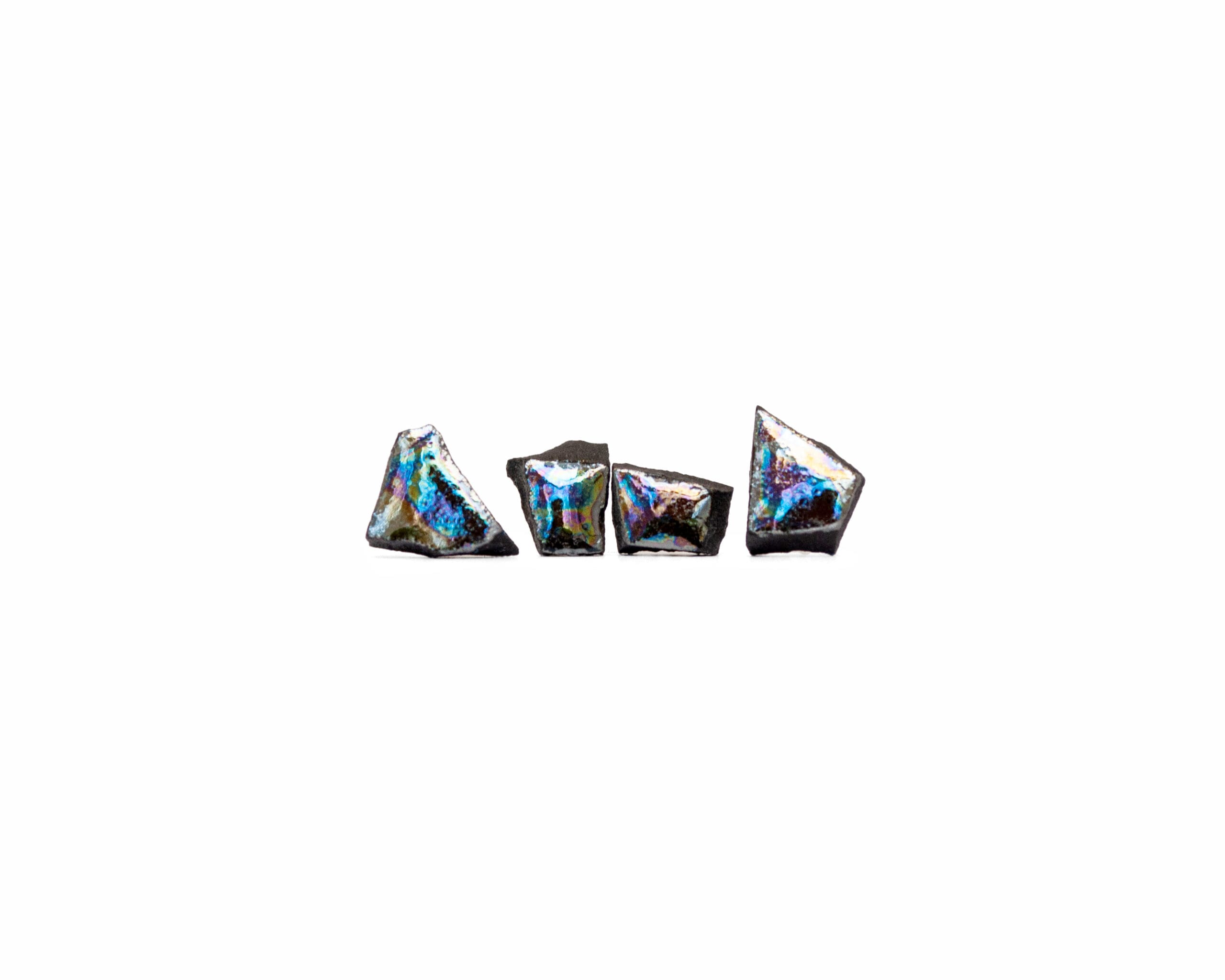 Black Smithereens Small earrings are inspired by the sharp beauty of shattered mirror shards. Handcrafted from black porcelain, each earring features a unique, organically broken shape — no two are exactly alike. The flat front is finished with hand-applied luster, available in three finishes: gold luster creates a warm, striking mirror-like reflection against the dark surface; platinum luster offers a cool, sleek shimmer; and mother of pearl luster brings an iridescent, colour-shifting quality that plays beautifully against the deep black porcelain. The sides are left natural and unglazed.