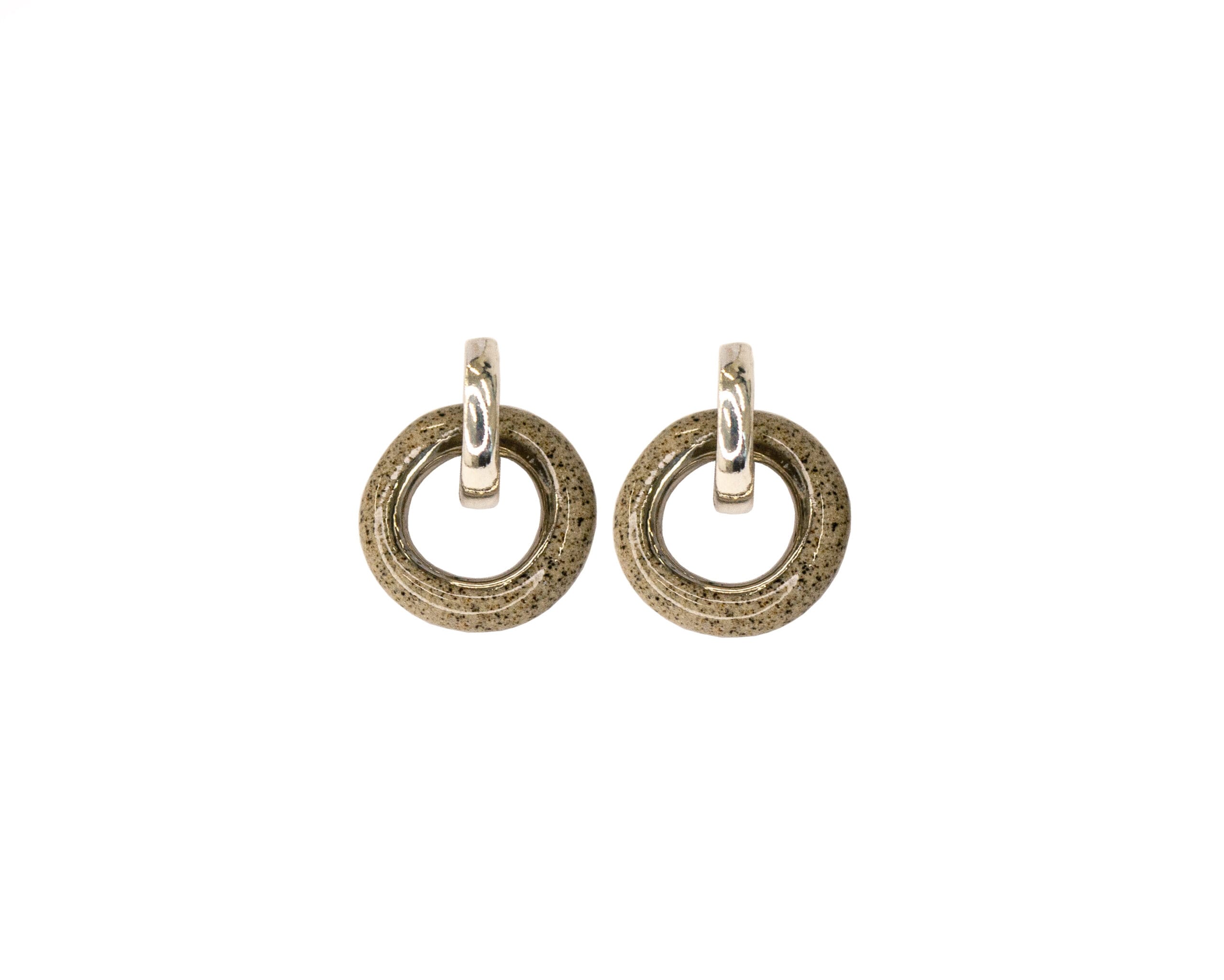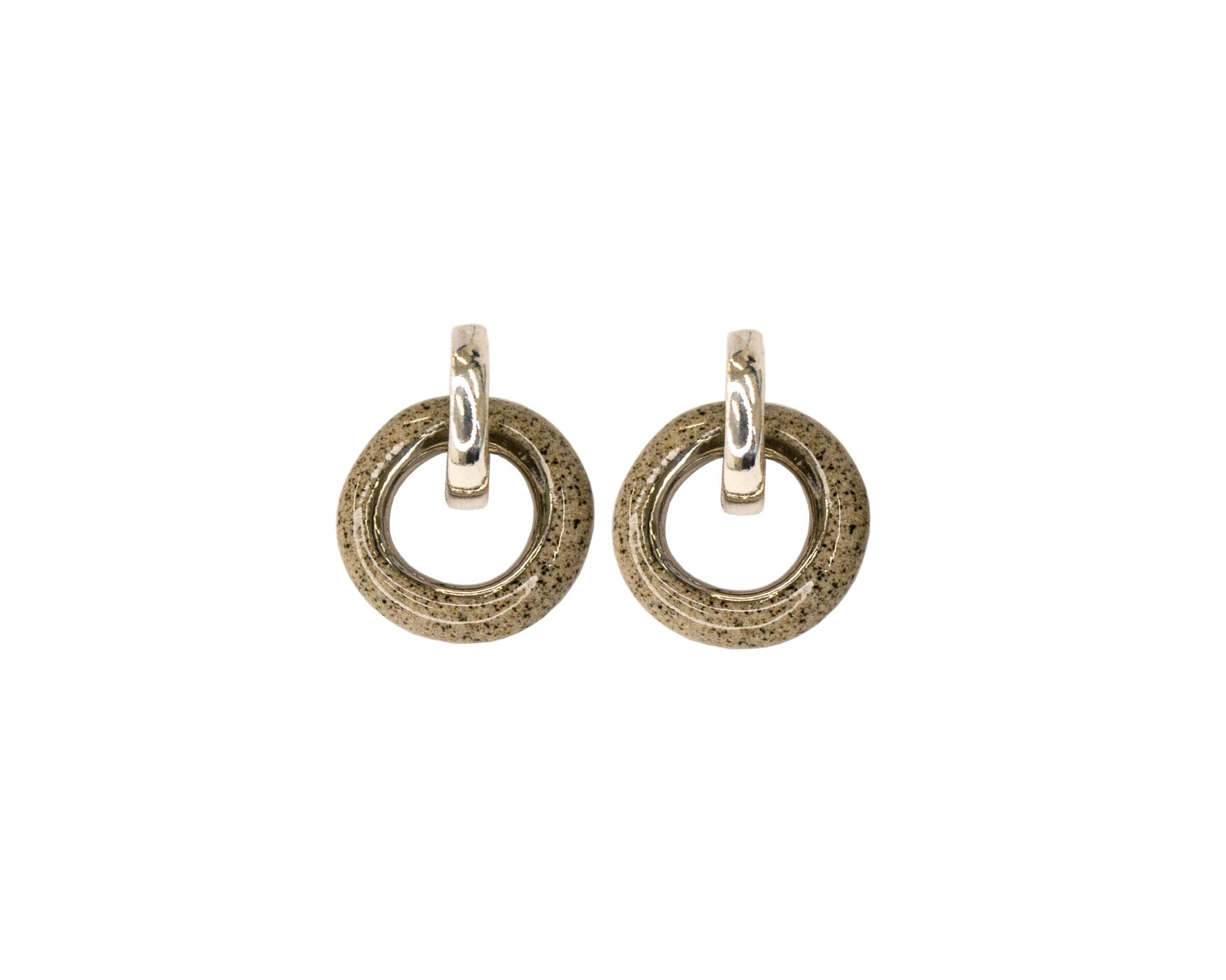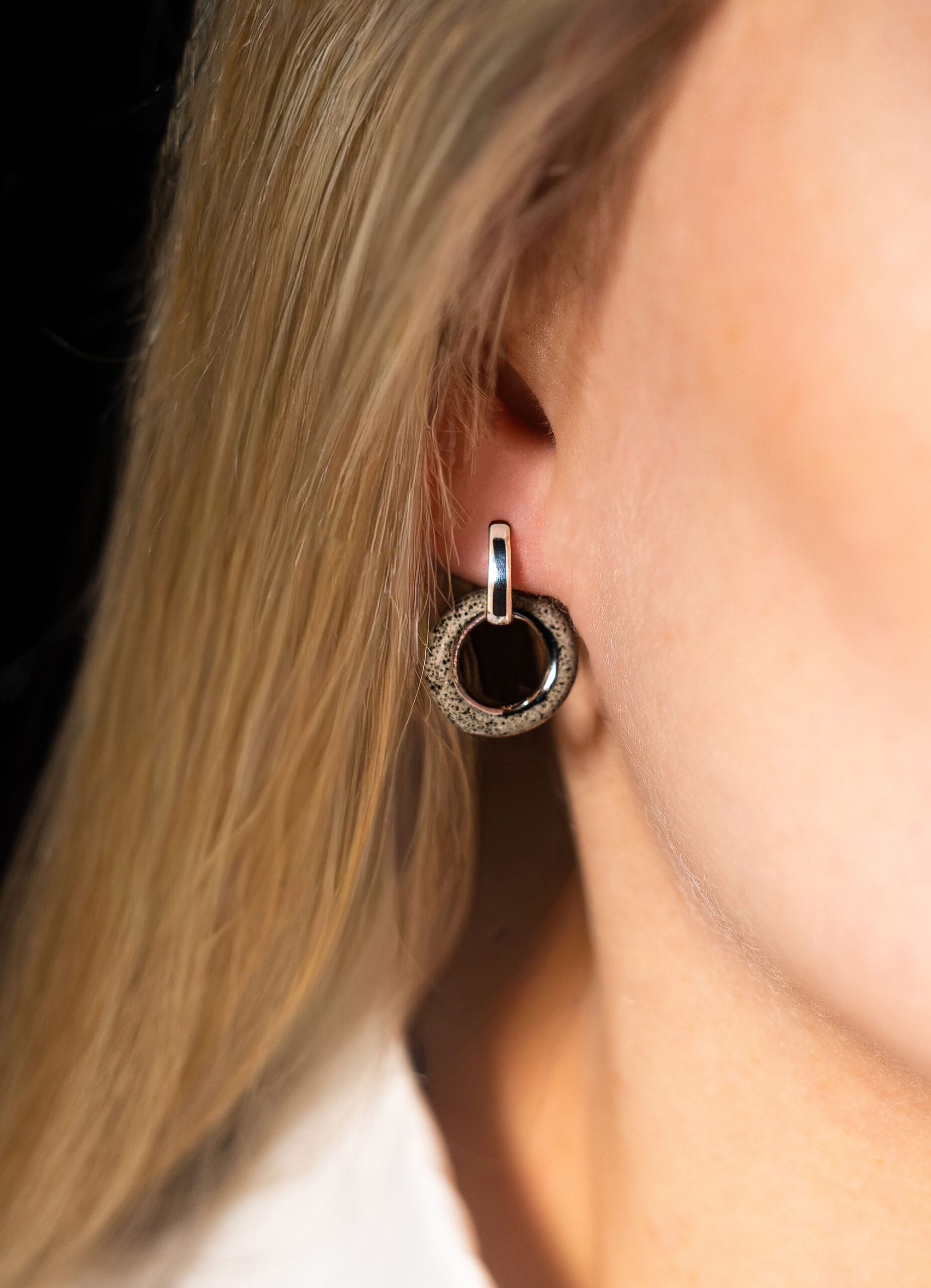 Duo Platinum earrings are built around a simple idea: one piece, two ways to wear it. The ceramic charm — a hand-formed stoneware ring with visible black grog texture, finished with a transparent high-gloss glaze and platinum luster — slides onto the sterling silver hoop and can be removed whenever you want a cleaner, more minimal look. Wear them together or apart, depending on the day.