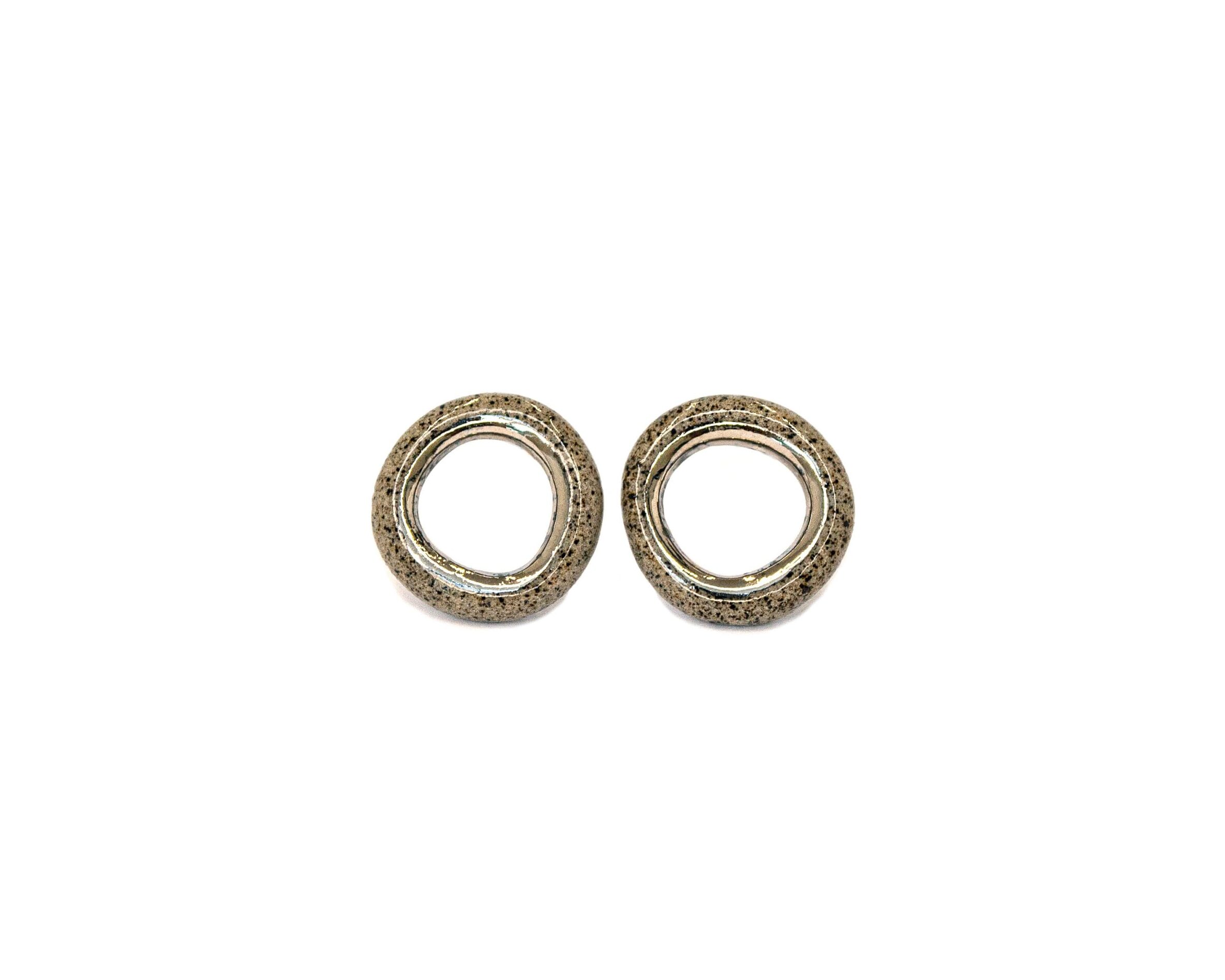 Discover the perfect balance of minimalist elegance and raw natural beauty with the Platinum Whisper earrings. Crafted from durable grey stoneware clay with black grog, these earrings feature a smooth, ring-shaped design that embodies simplicity and modern sophistication. The surface is coated with a clear, glossy glaze that enhances the natural texture of the clay, while the inner ring is highlighted with a hand-applied platinum luster, adding a subtle yet luminous silver shimmer.