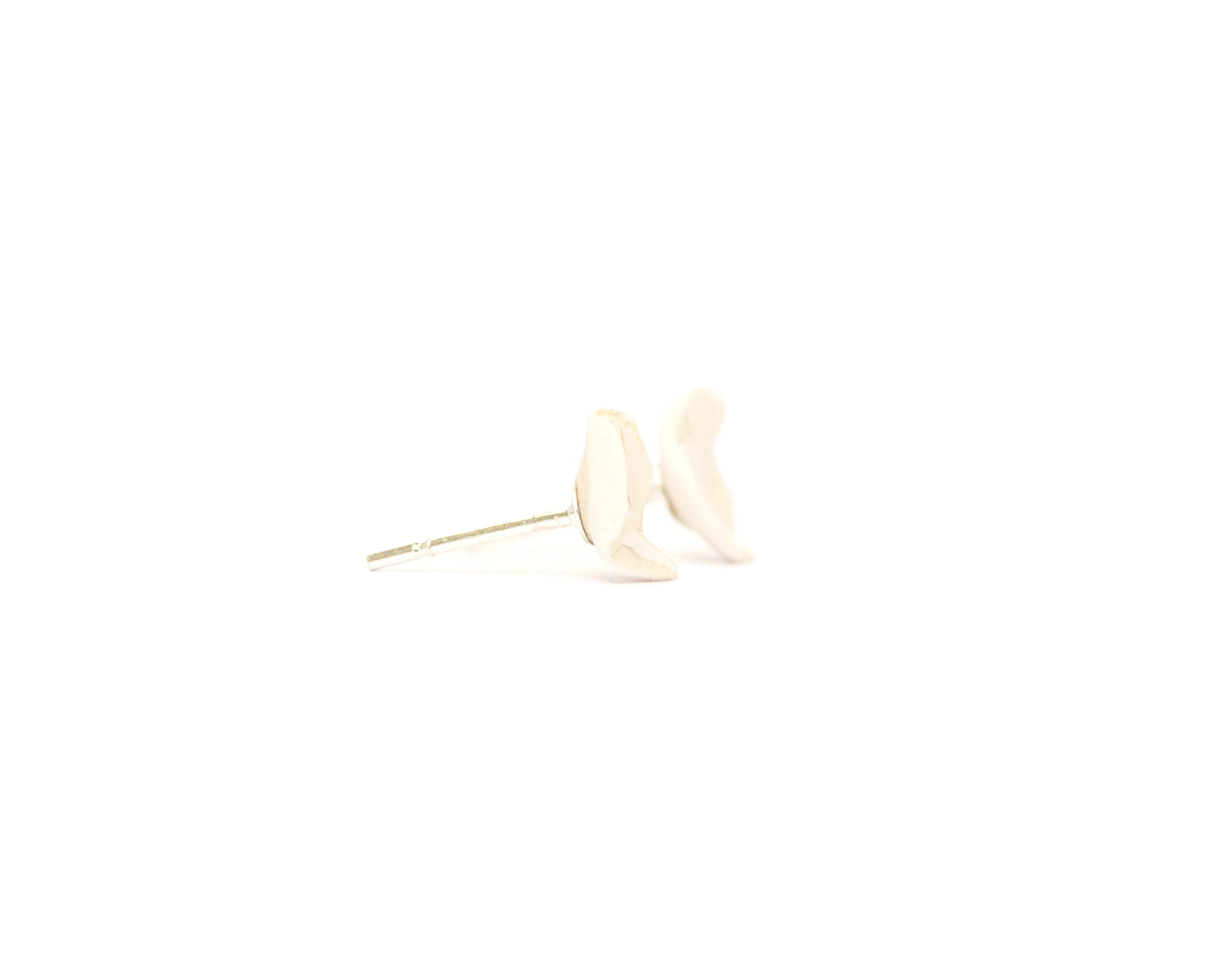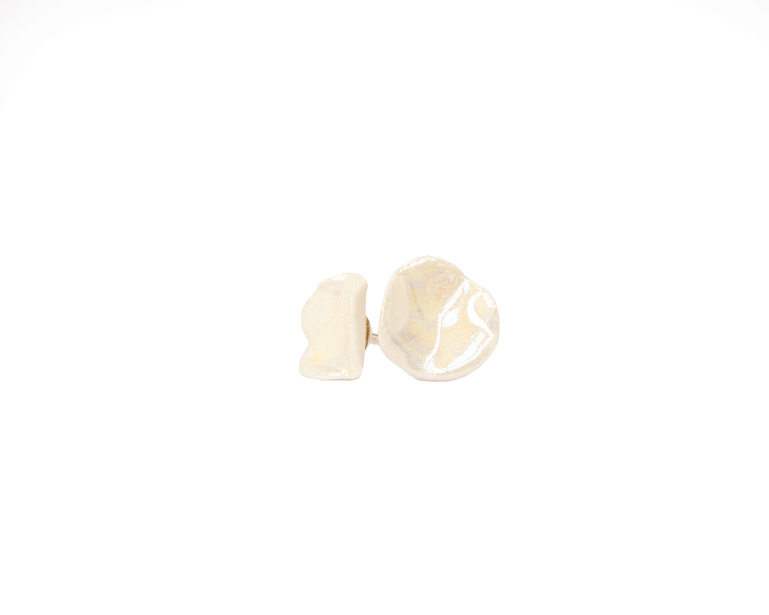 White Matter Small earrings are a study in quiet contrasts — the front face is covered in a transparent glaze and finished with gold luster, creating a warm, soft glow against the pale porcelain, while the same earring is also available with mother of pearl luster, a finish that behaves quite differently: softer and iridescent, it shifts subtly in the light and lends the white porcelain an almost luminous, pearlescent quality rather than warmth. The back is left completely unglazed — raw, matte, and natural. Two very different surfaces on a single small piece.