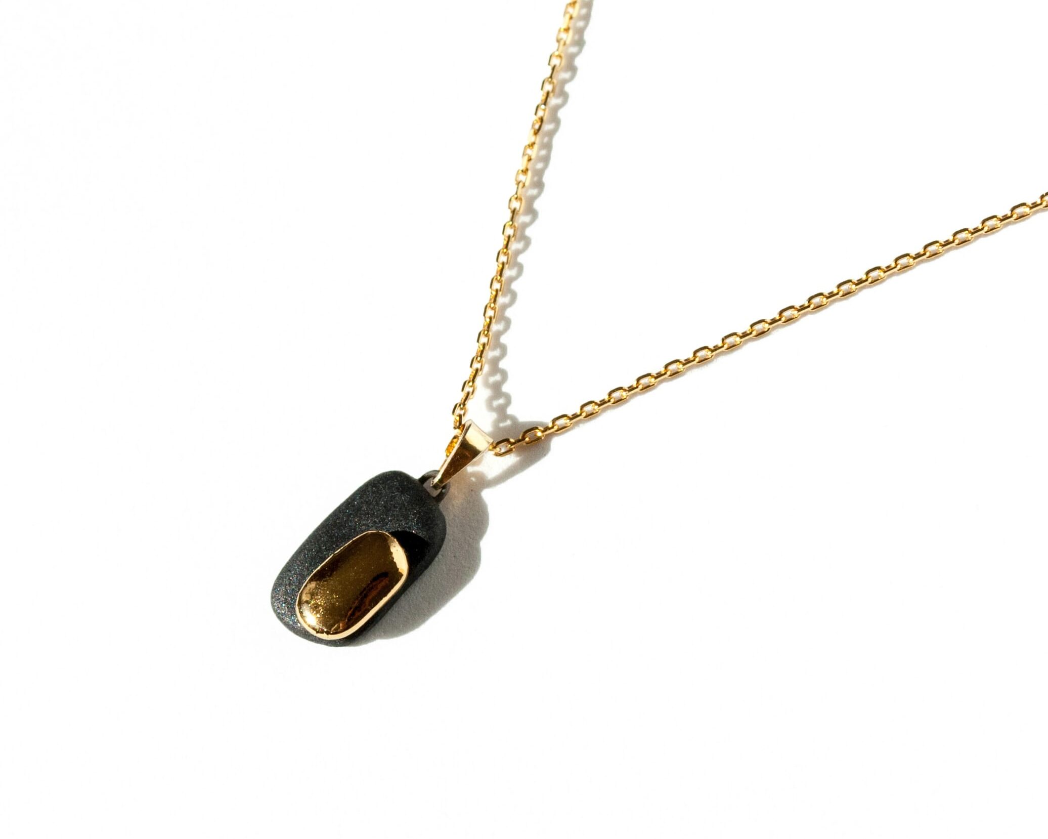 Dual celebrates contrast through form, finish, and texture. This one-of-a-kind pendant necklace is handcrafted from deep black porcelain and designed in two sculptural layers. The first layer is made from natural raw porcelain — showcasing the pure, matte beauty of the material. The second porcelain layer is finished with a glossy glaze and decorated with shimmering gold / platinum luster, adding depth and radiance.